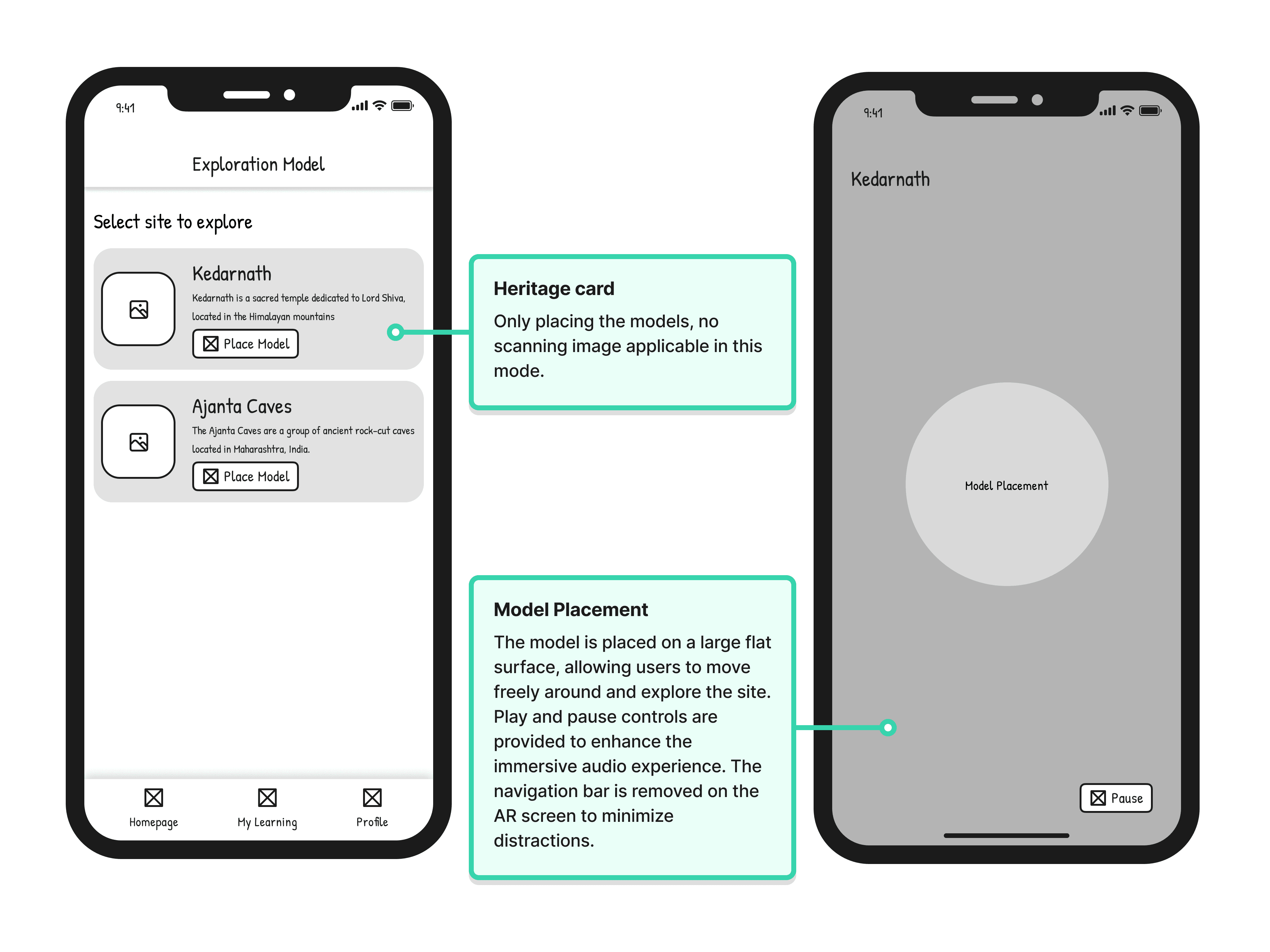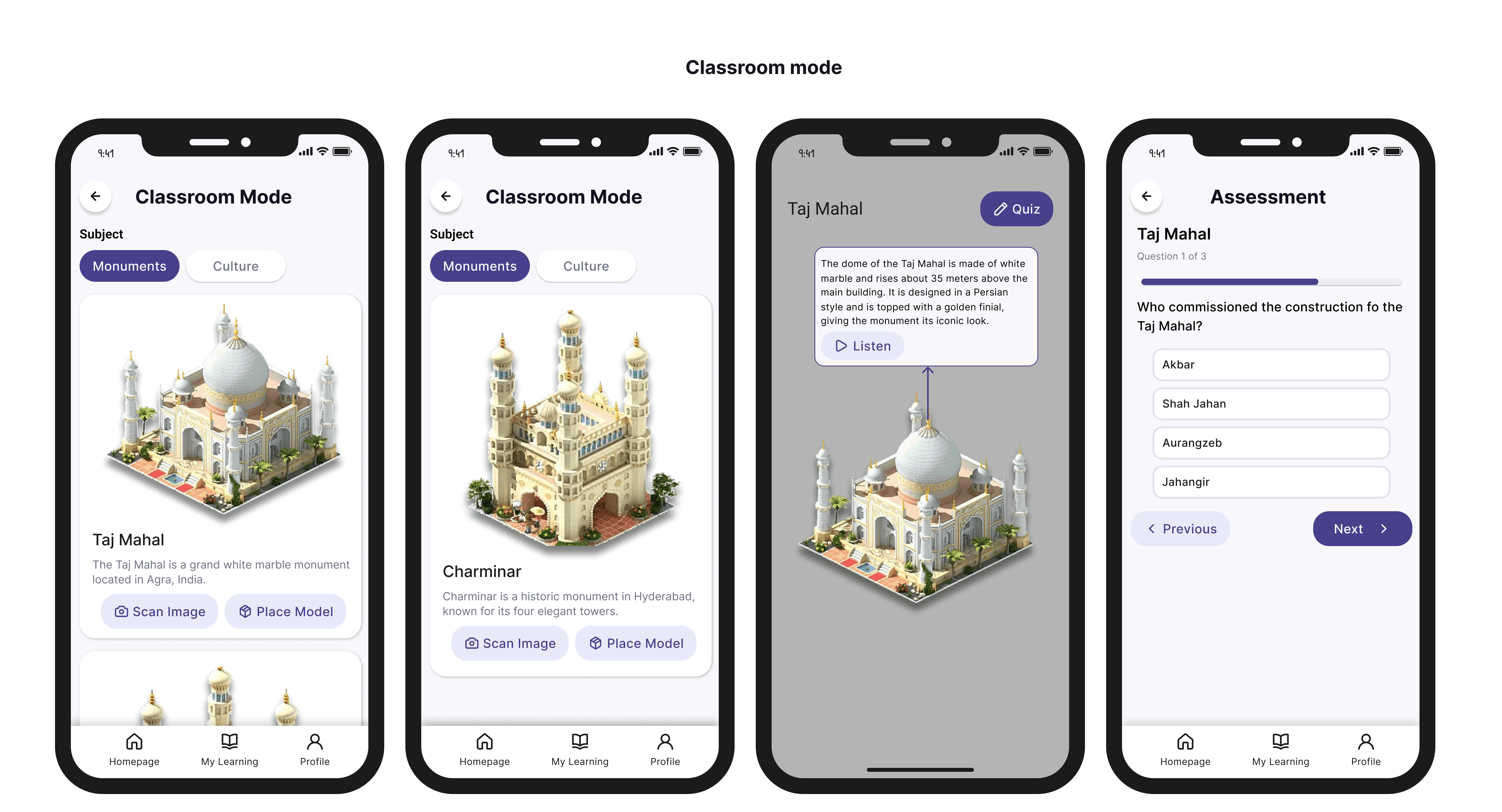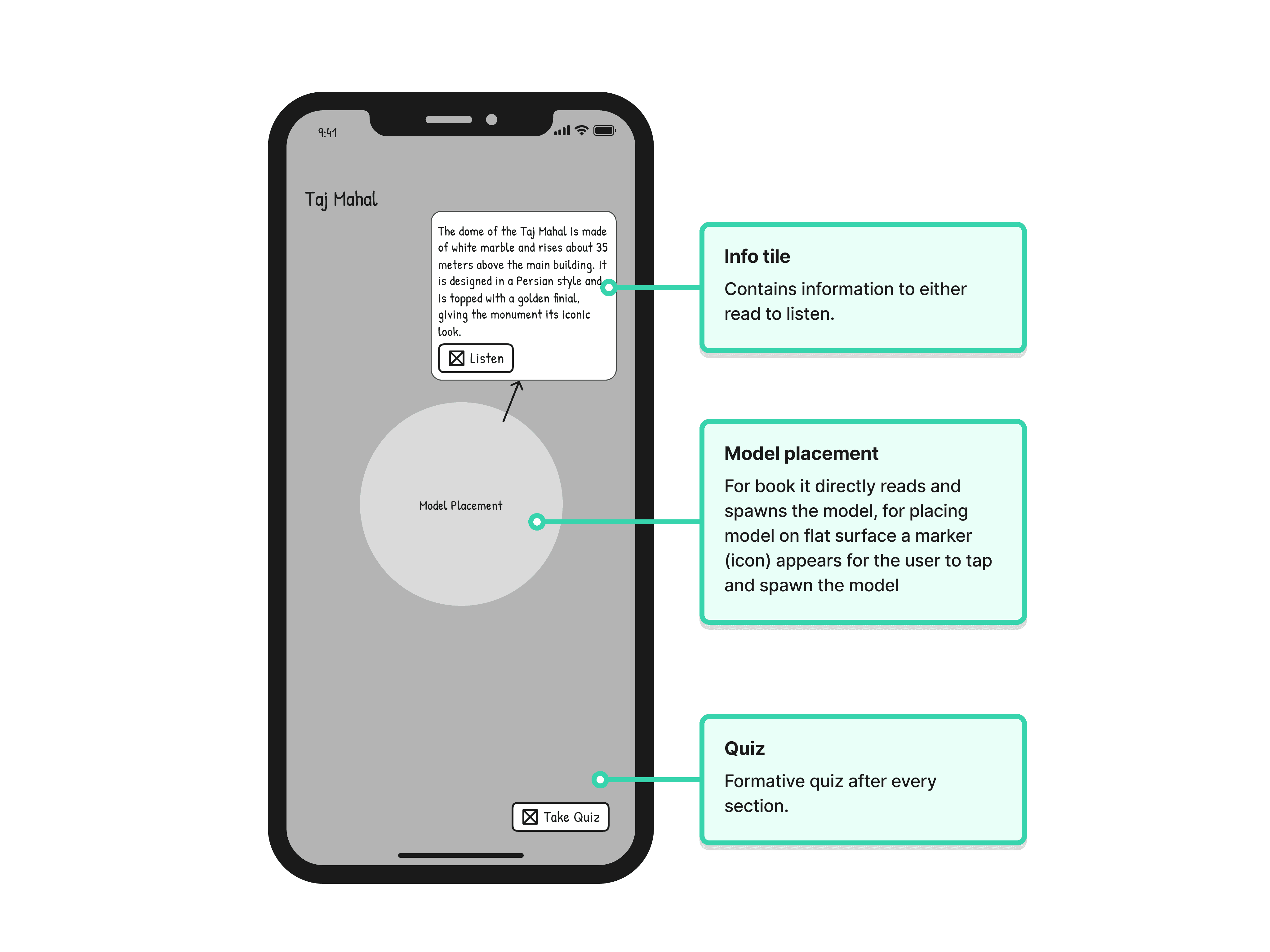 Exploration Mode (Curiosity-led & Immersive): Targeted at the teacher's goal of deep engagement. Using Plane Detection, students can place life-sized monuments in their own environment. This mode prioritizes "Presence"—incorporating ambient audio and walk-through capabilities to create an emotional connection.