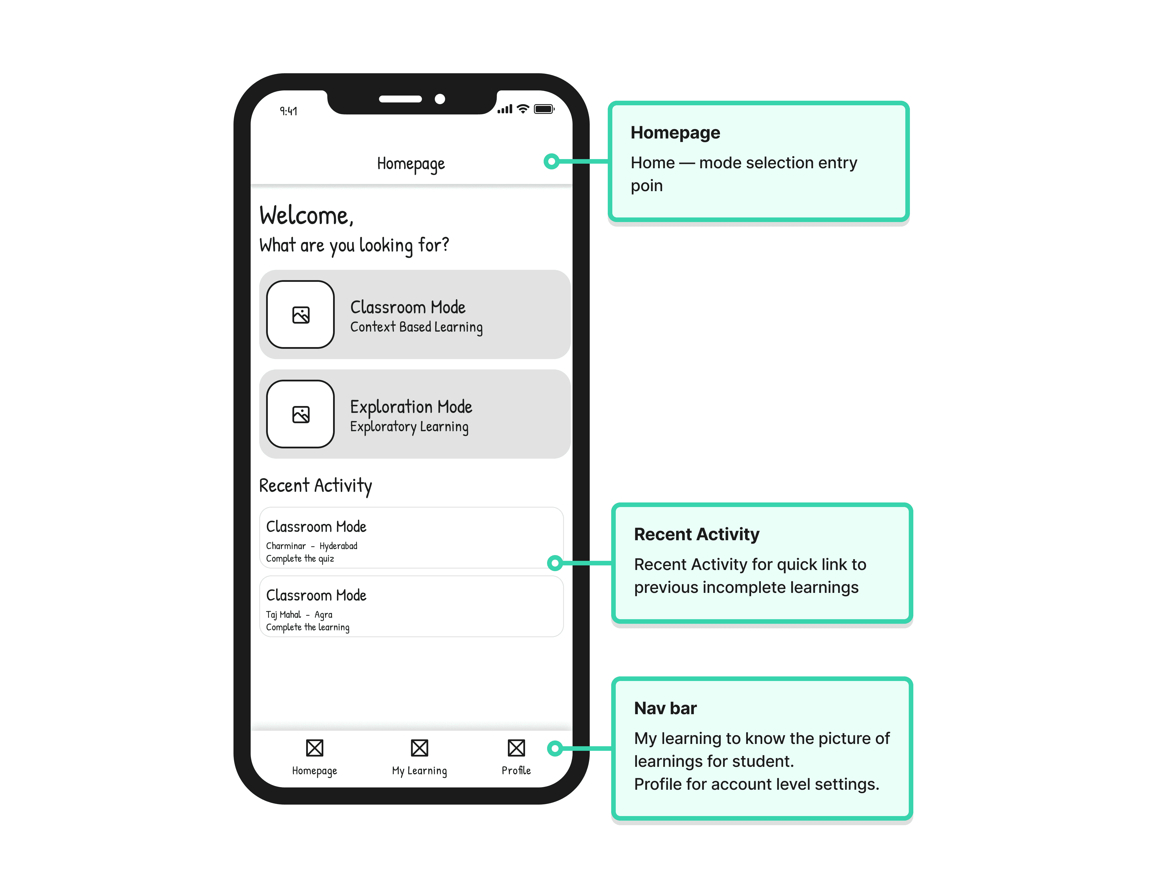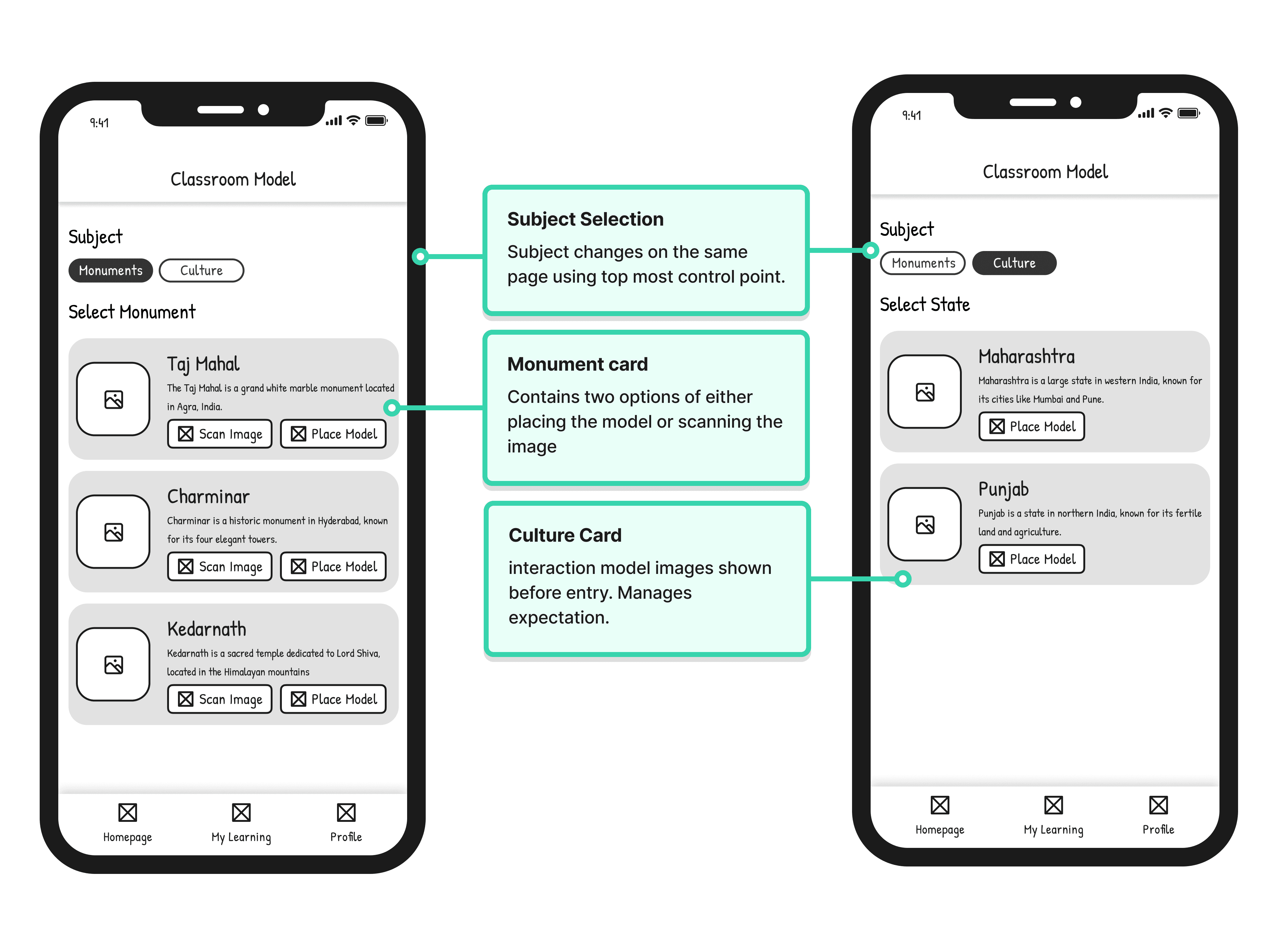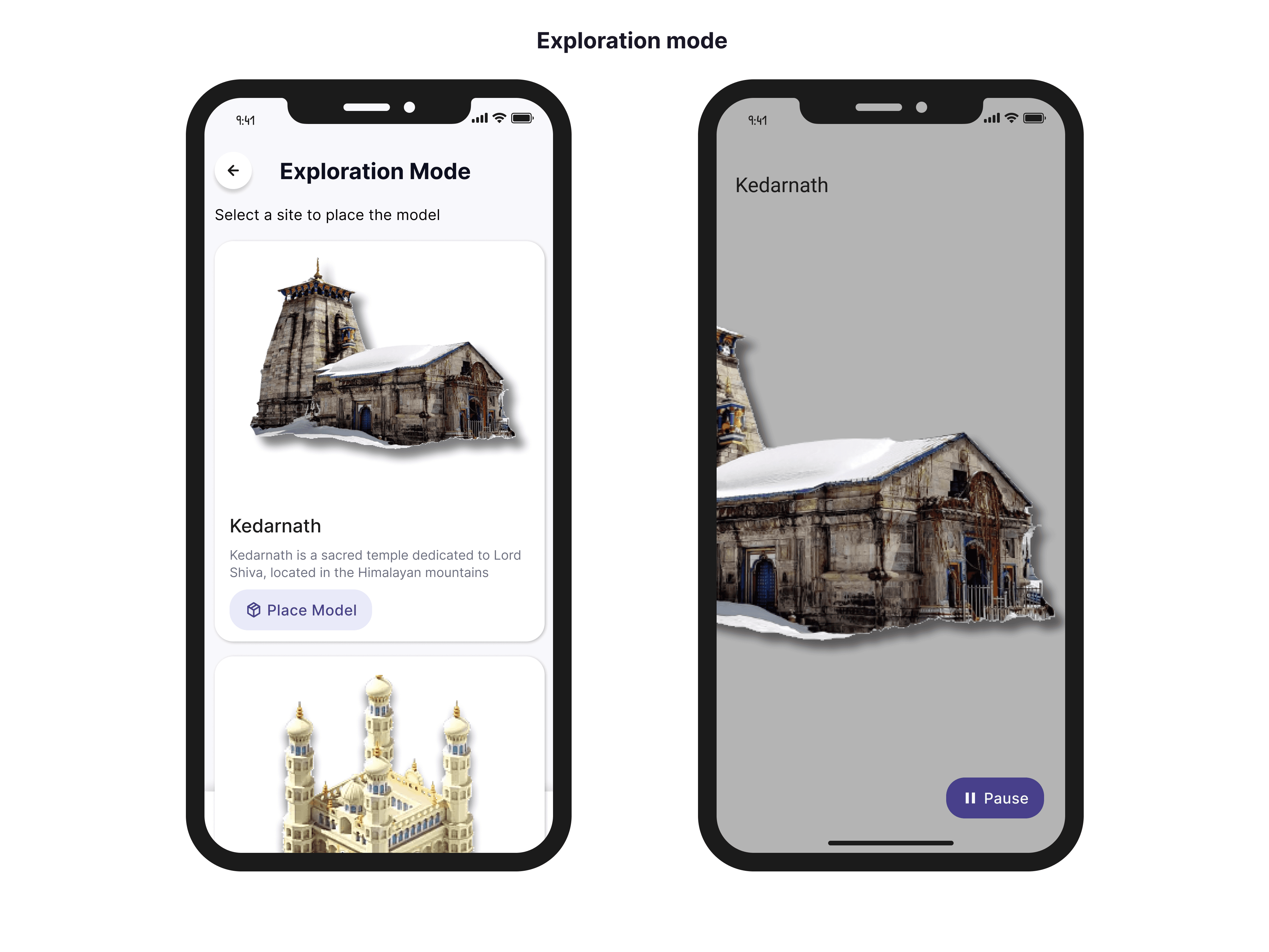 Exploration Mode (Curiosity-led & Immersive): Targeted at the teacher's goal of deep engagement. Using Plane Detection, students can place life-sized monuments in their own environment. This mode prioritizes "Presence"—incorporating ambient audio and walk-through capabilities to create an emotional connection.