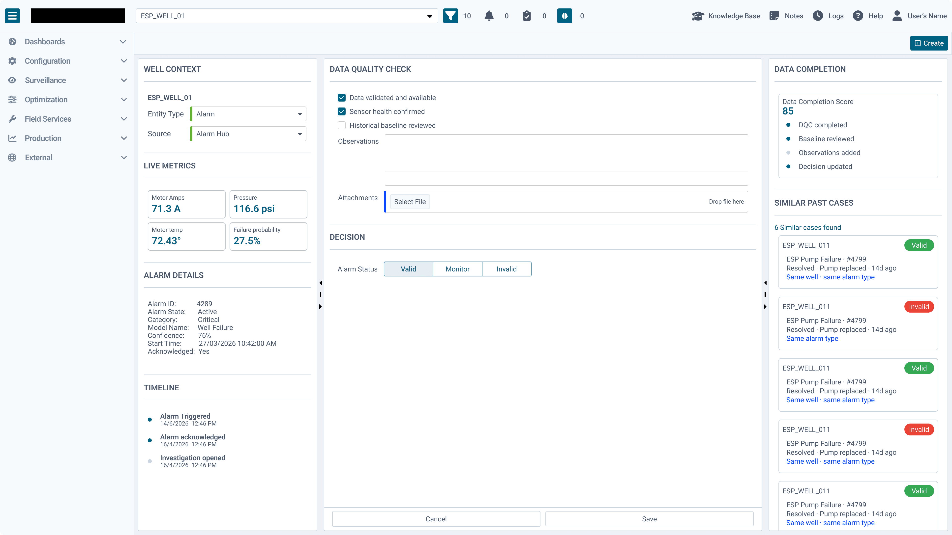 Workspace vs. Checkbox: Stakeholders suggested a simple checkbox for "Alarm Valid." I argued for a workspace because "Alarm Invalid" without supporting evidence is noise, not signal. To retrain AI, we needed the "Why."
